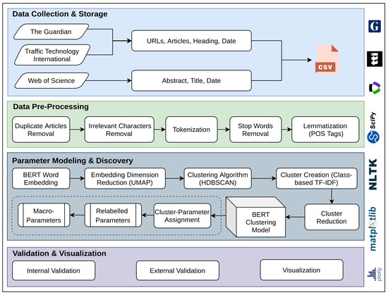 We implemented the proposed deep journalism approach into a tool called DeepJournal (Version 1.0). The tool is able to discover transportation parameters using the datasets described above. The tool comprises four software components; Data Collection and Storage, Data Preprocessing, Parameter Modelling and Discovery, and Validation and Visualisation. The three datasets were collected using web scraping and other techniques and were preprocessed to remove duplicate and irrelevant data, tokenise data, clean up the data, and lemmatise data to generate data in a form that can be processed by the deep learning processing engine. We used a pretrained BERT (bidirectional encoder representations from transformers) word embedding model [44] to capture the contextual relations within the data. The BERT model was used along with UMAP (uniform manifold approximation and projection) [45] (a dimension reduction technique), HDBSCAN (hierarchical density-based spatial clustering of applications with Noise) [46] (a clustering algorithm), and a class-based TF–IDF (term frequency–inverse document frequency) score, to automatically group documents in the datasets into document clusters.
