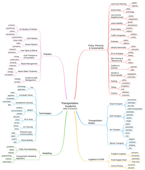 The academic-view dataset that we built to discover parameters for the academia-focused aspects of transportation is collected from an academic database, Web of Science. We collected in aggregate 21,446 research article abstracts (with titles and keywords) in the English language only from about 20 categories of academic disciplines in Web of Science, such as transportation science and technology, engineering, environmental science, telecommunications, economics, computer science, business, and others. The collected article abstracts were limited to the publishing years 2000 [42] to 2022 [43]. We discovered 49 transportation parameters from the academic dataset and grouped them into 6 macro-parameters. These are policy, planning and sustainability; transportation modes; logistics and SCM; pollution; technologies; and modelling.