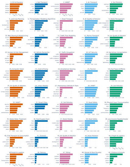 Das et al. [100] analysed 15,357 paper abstracts from 7 years of Transportation Research Board (TRB) yearly meetings (2008–2014) by using LDA to show the research patterns and intriguing histories of transport research. Sun and Yin [101] proposed an LDA-based topic modelling approach to find the research topics and temporal information over the last 25 years of transportation. They collected transport-related abstracts of 17,163 articles from 22 journals between 1990 and 2015 and applied LDA to discover 50 key academic research topics. In 2021, Putri et al. [102] proposed a systematic review of ITS by using the LDA and named entity recognition. They retrieved 23,823 titles and abstracts from the Scopus database between 1974 and 2020. Their research findings include the evolution of ITS development and related research areas. Some other research work has been conducted on several transport-related topics. For example, road safety is a significant component of the transportation system. Zou et al. [103] presented a scientometric analysis to reveal the core research area of road safety. The authors found that road safety studies focused mostly on driver psychological behaviour, prevention of traffic accidents, the impact of driver risk factors, and the analysis of the consequences and frequency of road crashes. In another research study, Gao et al. [104] presented a scientometric analysis on traffic safety sign research from 1990 to 2019. The authors collected 3102 articles from the Web of Science database and used Citespace to analyze and visualise the research domain. They discovered that most of the research had been conducted in the last 10 years. Their research also found that the United States is in the lead position in traffic sign research. AV is the most heavily researched topic to improve the transportation system. A scientometric analysis on autonomous vehicles was conducted by Faisal et al. [105]. They collected a total of 4645 research articles between 1998 and 2017 to perform the scientometric analysis. Their research presented the development of AV systems by analyzing the authors, affiliations, citations, and publications in AV research.