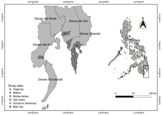This study was conducted in selected areas of the Davao Region (Figure 1). The Davao Region is a coastal area officially designated as Region XI in the Philippines that occupies the southeastern section of Mindanao. It has an area of 204.33 km2 as of 2013. It is composed of 5 provinces: the Davao de Oro (previously known as Compostela Valley), Davao del Norte, Davao del Sur (where Davao City was located, a highly urbanized city), Davao Occidental, and Davao Oriental.