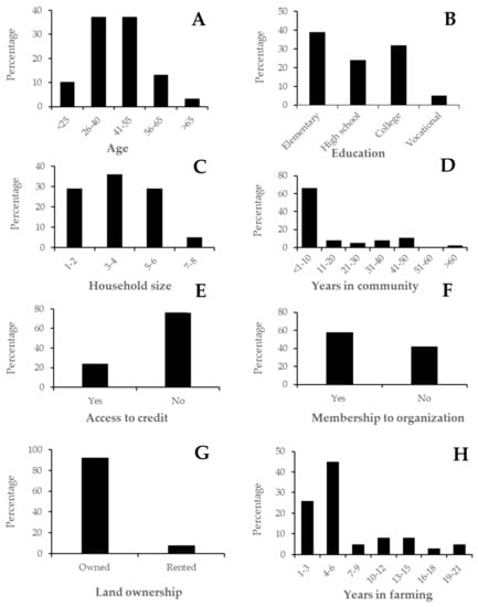Age of respondents (A), their level of education (B), household size (C), years in community (D), access to credit (E), membership to organization (F), land ownership (G), and years in farming (H).
