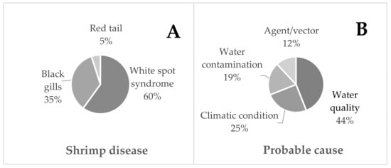 According to the farmers’ experience in diseases, particularly among smallholder farms, white spot syndrome (WSS) is the most contagious. Around 60% of the farmers that have encountered diseases on shrimp experienced WSS, 35% of them experienced Black gills syndrome, and 5% experienced red tail, otherwise known as Taura syndrome (Figure 4A). The farmers mentioned probable causes of diseases; most of them (44%) identified water quality as the main cause of the presence of diseases such as WSS, black gills, and red tail. Water quality refers to the alkalinity, acidity, temperature, salinity, and level of dissolved oxygen in the pond water. They were also aware of the effects of climatic conditions (25%) on shrimp diseases such as WSS and black gills. Climatic conditions such as heavy rain, hotter temperature, and rising sea level can sometimes directly affect the ponds. For instance, heavy rains can lead to flooding, which changes the quality of water. These factors could affect shrimp culture since shrimp are sensitive to changes in their environment, especially water quality. Farmers have also mentioned cases of water contamination (19%), where water is contaminated with diseases or pathogenic organisms, pesticides, and other chemical substances brought by flooded water. The transmission could also be vector-borne (12%), either by human or animals that cause the spread of the particular diseases (Figure 4B). However, these factors are found to be less prevalent in commercial farms, as they have well-constructed ponds and an availability of resources to mitigate these factors.