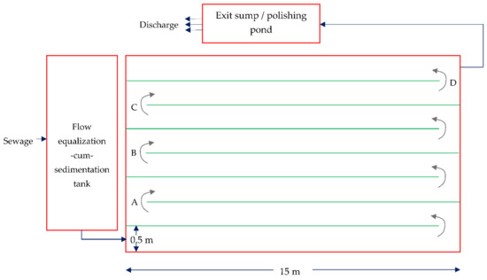 In the first phase of the experiments, effect of hydraulic retention time on the level of treatment, without and with macrophyte, was assessed. For this half of the design flow, 27,000 LPD was routed to the SHEFROL® unit to achieve a maximum hydraulic retention time of 8 h. Samples of the incoming raw wastewater and the outgoing effluent were drawn every day, at 14.00 h. Samples of sewage were also drawn from four points in its path, as marked in Figure 1, corresponding to hydraulic retention times (HRTs) of 2, 4, 6, and 8 h. The samples were preserved and analysed as per standard methods prescribed by the consortium of American Public Health Association and American Water Works Association [17]. The extent of primary treatment was assessed in terms of removal of suspended solids (SS), the secondary treatment in terms of removal of chemical oxygen demand (COD), and tertiary treatment as represented by the removal of total Kjeldehl nitrogen (TKN) and soluble phosphorous (SP).