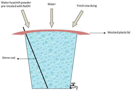 For the first step of utilisation, harvested plants were air dried in the sun and subjected to acid-phase digestion for obtaining volatile fatty acids (VFAs). The VFAs are energy precursors because they can be converted into biogas in any functioning anaerobic digester [18]. The dried E. crassipes was powdered and pre-treated with aqueous NaOH solutions to break the weed’s lignin matrix and enhance its biodegradability. It was then fed to acid phase reactors consisting of 15 L fibreglass vessels with provision of periodic stirring and product removal (Figure 2). Fresh cow dung, which is rich in microflora including cellulolytic, acidogenic, and acidogenic bacteria, was used as inoculum while the operating conditions were kept such that anaerobic conditions did not develop and the possibility of VFAs becoming decomposed into biogas in the acid phase reactors did not arise. The process parameters were optimised with the help of Taguchi method, which is considered to be a well-tried and tested procedure for process optimization [19,20]. For it, the Taguchi L9 matrix was set for four parameters at three levels: aqueous NaOH (2.5%, 5% and 7.5% weight/volume), soaking time (24, 48, and 72 h), NaOH reused (un-reused, once-reused, twice-reused), and cow dung concentrations (0.5%, 1% and 2.5%, dry weight basis). Experiments in duplicates were performed accordingly (Table 1). Measured quantities of powdered weed were pre-treated with aqueous NaOH, the pH of the mixture was adjusted to 7 ± 0.5, and the mixture transferred to the acid phase reactor (Figure 2). Dilution water and fresh cow-dung inoculum, quantified on the basis of dry weight earlier computed by drying a known quantity of cow dung to a constant weight at 105 C, were added. The contents were manually stirred for 30 s once every 6 h.