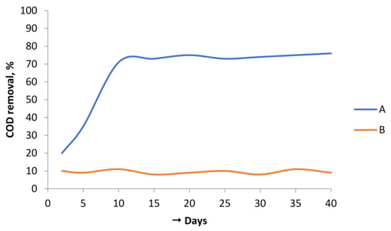 Pattern of COD removal as a function of time. Curve A: removal in channels planted with E. crassipes; curve B: removal in control (plant-free) channels.