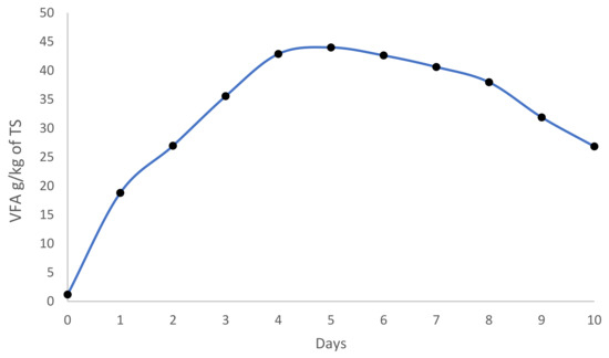 Generation of significant quantities of VFAs occurred in the acid phase reactors (Figure 2) by the end of the first 24 h. The cumulative VFA production followed a bell-shaped curve as illustrated in Figure 4, reaching a peak in 4–6 days. The VFA concentration then began to decline—possibly because fresh VFA generation slowed down while the already-formed VFA began to decompose. Hence, an HRT of 5 days appears ideal for achieving maximum VFA yield. However, it is advisable to perform a few trial runs before setting up the HRT because the number of days to the peaking of the VFA yield may vary in the 4–8 day range, depending on ambient conditions. We have found it to be so in past studies [22,23].