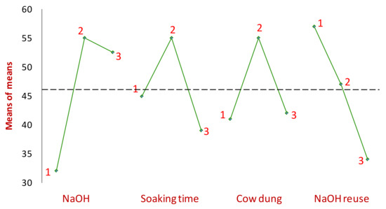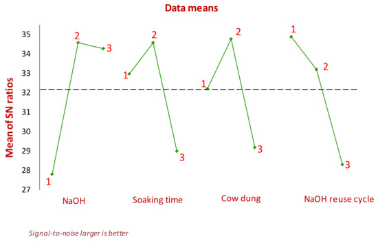 The VFAs produced by different combinations of influencing parameters are given in Table 1. The main effects plots for means and SN (signal–noise) ratios, as generated on applying the Taguchi matrix, are as seen in Figure 5 and Figure 6, respectively. Both types of plots have similar trends. It is seen that a change in the NaOH concentration from 2.5% to 5% has a very pronounced effect on VFA generation. A further increase to 7.5% causes a lowering in the VFA yield. Changes in soaking time and cow-dung concentration show a similar trend; the only difference being that a change from level 2 to level 3 brings a much sharper decline in the VFA yield in these two cases than was witnessed in case of NaOH concentration.