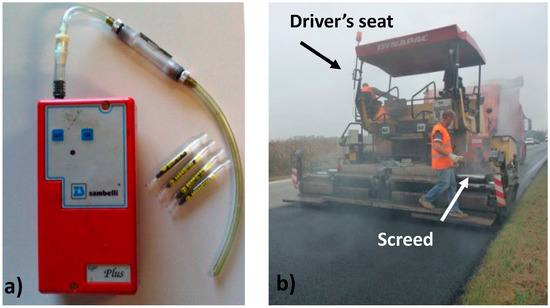During the construction of the trial section, we sampled the gaseous emissions by using a pump with active granular carbon cartridges that absorb the fumes (Figure 1a). The pump had a flow rate of 0.5 L/min, and we collected the fumes for 5 min per sample, with two replicates. The samples were taken at the driver’s seat of the paver and the screed (Figure 1b). At the same time, we measured the temperature of the air and the wind speed by using a Kestrel weather tracker anemometer, and asphalt mixtures, at the driver’s seat of the paver and the screed (Table 1). The cartridges were then stored at freezing temperature until laboratory analysis. The matrixes were subjected to solvent extraction by using methylene chloride in an ultrasound bath for 60 min [36,37]. Subsequently, we carried out the analyses in a gas-chromatographic apparatus Agilent 7890/5975, equipped with an HP5-MS capillary column (30 m × 0.25 mm × 0.25 m), in order to analyze the content of PAHs and VOCs.