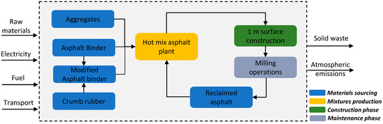 Life Cycle Assessment (LCA) is a comprehensive methodology to quantify the environmental performance of goods and services [21,22,23]. In the case of the road pavements, the adoption of the LCA is especially useful in the case of innovative materials containing recycled products, which may be attractive for applications because of their contribution to the reduction of raw materials and nonrenewable resources [24,25,26,27,28,29].