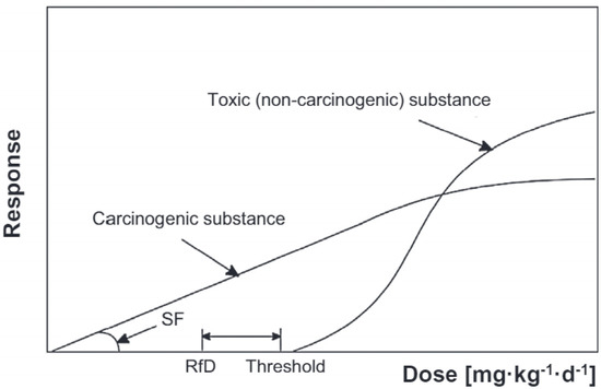 Figure 3 shows that the shape of the dose-response curves is different for toxic (noncarcinogenic) and carcinogenic substances. For the toxic substances, the dose threshold is considered because there are no harmful effects from that substance. In this case, the risk evaluation requires the use of a reference dose (RfD). By comparison, for carcinogenic substances, the concept of a threshold is no longer valid since the health of human beings is damaged at any considered dose. We can assume that, in a wide dose range, the response curve is linear, with the consequent identification of a slope factor (SF). We used RfD and SF values from the database of the Italian National Health Service Istituto Superiore di Sanità (ISS) [43]. The dose value (D, in mg·kg−1·d−1) used as an input was calculated for each compound, using Equation (2), where C is the compound concentration (in mg/m3) in the fumes sampled on site.