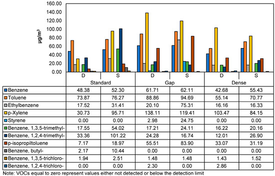 VOCs of gaseous emissions (µg/m3) at the paver (D: driver’s seat; S: screed).