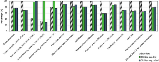 We implemented the human toxicity associated with paving workers in the ILCD method. Characterization factors calculated to quantify the impact category related to workers are reported in the Supplementary Materials. Figure 6 shows the results of the LCRA in terms of human toxicity (carcinogenic and noncarcinogenic effects) of pavement workers exposed to asphalt fumes during hot mix asphalt laying operations, in addition to the other environmental impact categories already included in the ILCD method. In Figure 6, the highest value was set as equal to 100% and the others were calculated as a proportion. The asphalt mixture modified with CR containing the higher percentage of asphalt binder had cancer effects on workers 3.5 times and 2.9 times higher than the CR mixture with lower asphalt binder content and the standard mix, respectively. By comparison, the toxicological effects were 1.3 and 1.2 times higher for the CR mixture with the higher binder with respect to the other CR mixture and the standard blend, respectively.