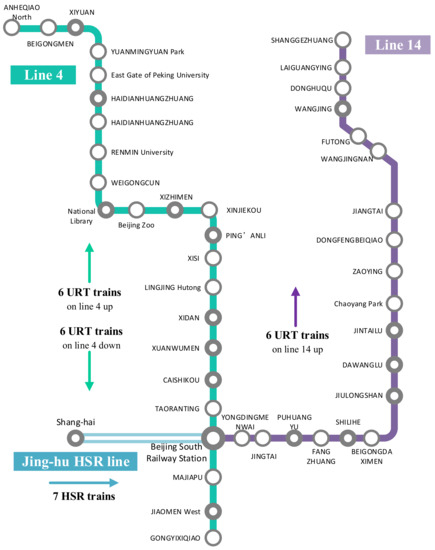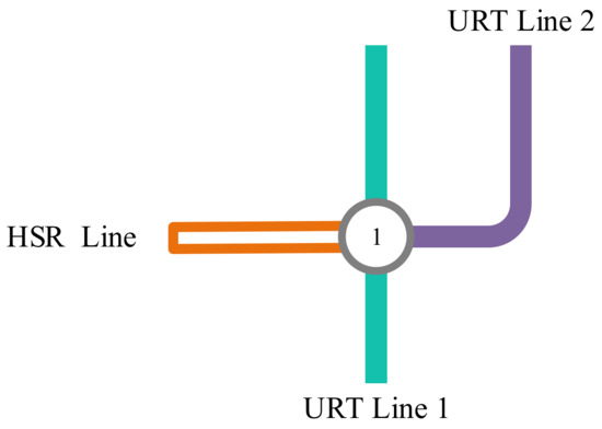 A network including an HSR line and URT lines is given as some lines and stations. Clearly, one HSR line and two URT lines are shown in the illustrative network Figure 1.