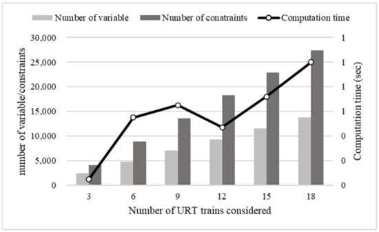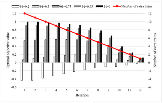 We now study the influences of different values of on the optimal values. The value of is proportional to the value of , which is the weight for the objective . At each iteration, the optimal value increases with an increase in the value of , as illustrated in Figure 7. The bars indicate optimal values of the function (i.e., objectives of expected transported passengers and operation-ending time) and refer to the Y-axis on the left-hand side. The lines (with symbols) indicate optimal values for the objective of the number of extra trains in Figure 7 and refer to the Y-axis on the right-hand side.
