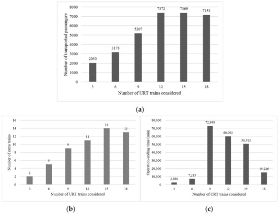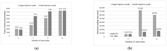 Recall that three objectives are considered as maximizing expected transported passengers , minimizing the number of extra URT trains , and minimizing the operation-ending time of all extra trains in the multi-objective model. The single-objective model focuses on the maximization of expected transported passengers and neglects minimizing the number of extra trains and total operation-ending time. We report the values of three objectives obtained by single-objective and multi-objective models in Figure 9. The bars indicate the expected transported passengers in Figure 9a and operation-ending time in Figure 9b, respectively, and refer to the Y-axis. The values of the objective of the number of extra trains are reported in the X-axis in Figure 9a,b.