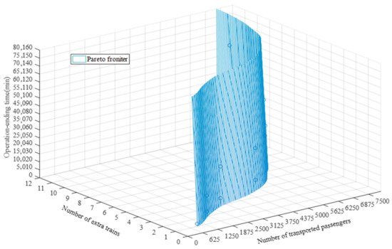 This section studies the multi-objective problem, for instance (Table 6), with URT trains. We tested several settings of for the iterative approach. Recall that two objective functions of the expected transported passengers () and the operation-ending time of all extra trains () will be a single objective function by using the weighted-sum method with a fixed value on or .