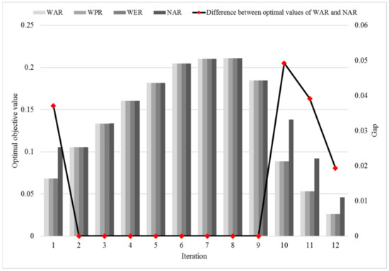 Figure 10 illustrates the results of case WAR, WPR, WER, and NAR. The bars indicate the optimal objective value and refer to the Y-axis on the left-hand side; the line (with symbols) indicates the gap of optimal objective value between WAR and NAR and refers to the Y-axis on the right-hand side. Figure 10 does not show the gap of the optimal objective value between WAR, WPR, WER, and NAR, for the optimal objective values of WAR, WPR, and WER are identical at each iteration.