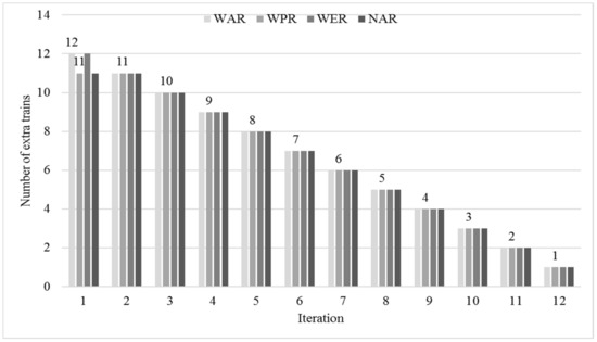 Number of extra trains () of WAR, WPR, WTR, and NAR.