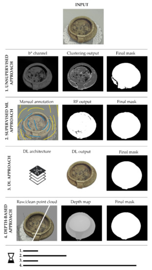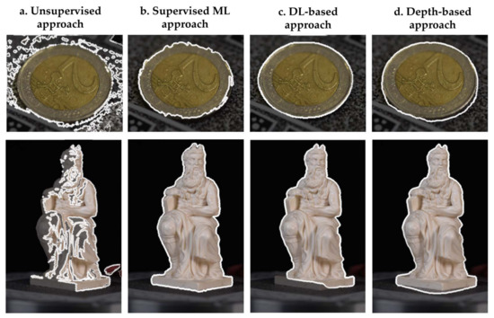 - Depth map-based approach: given a set of images of an artefact, depth maps are extracted by applying photogrammetric processing at a low image resolution. Possible points belonging to the artefact background are removed from the dense reconstruction before exporting the depth maps, correcting correspondent brightness and contrast values. Then, some image processing filters are applied to the exported depth maps, such as (i) a Gaussian blur filter, or Gaussian smoothing, to minimise image noise, and (ii) a Posterisation filter to reduce the amount of image colours while restoring sharper edges. In the developed procedure, the post-processing phase is run in a single round until mask generation. It is also worth noting that depth maps could be quickly predicted using monocular techniques and deep learning networks [97]. However, while promising for dealing with the typical ill-posed problem, these approaches are not well suited for masking artefact datasets, and further research in this field is required.