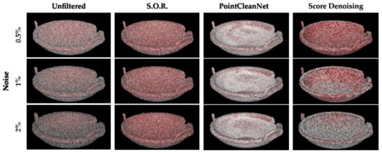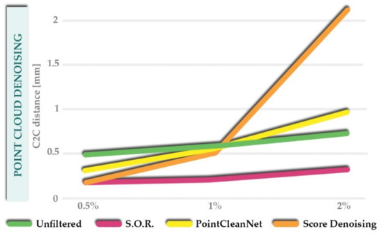 - Score-based denoising [66]: it relies on a neural network architecture that employs the estimated score of some point distributions to perform gradient ascent and denoise the point cloud. A noisy point cloud distribution is treated as a set of noise-free points p(x) convolved with a noise model n. The (p*n)(x) mode is, in this case, the underlying clean surface. The log-likelihood of each point is increased via gradient ascent and each point position is iteratively updated, while outliers are neither detected nor removed.
