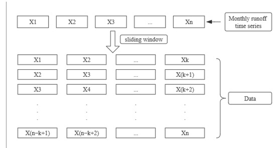 When machine learning models are used for autoregressive forecasting of monthly runoff series, it is necessary to process the data to fit the machine learning model. A commonly used method is the sliding window method. Suresh et al. [21] chose a sliding window with a time step of 10 to apply to a convolutional neural network (CNN) model. Different time steps can affect the performance of these models, so it is necessary to determine the optimal time step, which increases the complexity of the application. Therefore, this study proposes an interval sliding window algorithm based on sliding windows with correlation coefficients.