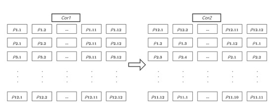 The main idea of the ISW algorithm is as follows. For the monthly runoff series X1, X2, …, Xn, the sliding window algorithm is first used to select a time step of 13 to obtain the data matrix Data(n−12)×13 (Figure 2 shows a sliding window plot with time step k). Then, the runoff correlation coefficient matrix Cor112×12 is calculated for 12 months, and the correlation coefficient matrix is rearranged to obtain Cor2 as shown in Figure 3, where the first row represents the correlation coefficients of all months with January, the second row represents the correlation coefficients of all months with February, and so on. The column m with the largest correlation coefficient is selected as the predictor. Observing the data obtained via the above method, it is found that the process of obtaining the data can be imagined as a sliding window with intervals, so this method is named interval sliding window.