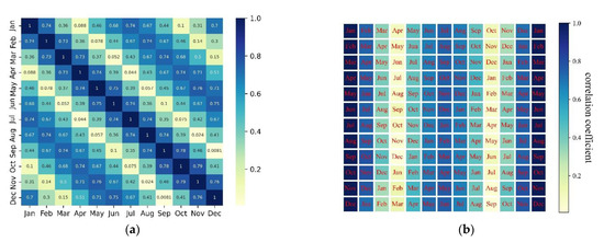 This section describes the use of the ISW algorithm to process the monthly runoff series of Jiutiaoling station and Zamusi station. Firstly, the correlation coefficient matrix of monthly runoff was calculated, and the correlation coefficient matrix was converted according to the description in the interval sliding window algorithm, as shown in Figure 5.