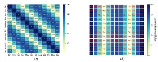 Correlation coefficient matrix and transformed correlation coefficient matrix: (a) Correlation matrix of monthly runoff series at Jiutiaoling station; (b) reordering of monthly runoff correlation coefficient matrix at Jiutiaoling station; (c) correlation matrix of monthly runoff series at Zamusi station; (d) reordering of monthly runoff correlation coefficient matrix at Zamusi station.