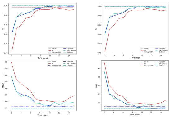 Analyzing the RMSE, the RMSE was 2.720 for ISW-RF, 2.635 for ISW-LightGBM, and 2.450 for ISW-CatBoost. The RMSE values of the RF and CatBoost models using sliding windows decreased with increasing time step and then tended to increase, and at the lowest point they did not reach the level of ISW-RF at the lowest point. The RMSE of the LightGBM model using sliding windows decreased with increasing time step and reached the level of ISW-LightGBM at a time step of 9, and then remained consistent with the RMSE of ISW-LightGBM. In terms of MAE, the MAE of ISW-RF was 1.847, that of ISW-LightGBM was 1.781, and that of ISW-CatBoost was 1.671. The MAE minima of both the RF and CatBoost models using sliding windows were not at the level of ISW-RF and ISW-CatBoost. The MAE of the LightGBM model using sliding windows dropped lower than that of ISW-LightGBM at a time step of 9. The results of the above two metrics show that the ISW algorithm performed better than the sliding window algorithm.