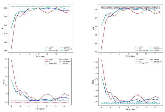 The monthly runoff series data of Jiutiaoling station and Zamusi station were taken from January 1972 to December 2018. A training period from January 1972 to December 2008 and a validation period from January 2009 to December 2018 were selected in this study. In comparison with the ISW algorithm, the sliding window algorithm selected 2–15 time steps, built RF, LightGBM and CatBoost models, and used four evaluation metrics, R, NSE, RMSE, and MAE. We compared and analyzed the performance of the ISW algorithm and the sliding window algorithm with different time steps in different models. Figure 6 and Figure 7 show the performance comparison of the sliding window algorithm and ISW algorithm with different time steps in the validation period.