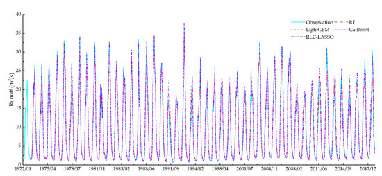Monthly runoff data for the Jiutiaoling and Zamusi stations from January 1972 to December 2008 and January 2009 to December 2018 were used to obtain the required training and validation datasets, respectively, for the machine learning model using the ISW algorithm described above. During the model training process, the parameters of a machine learning model affect its performance; the grid search algorithm was used in this study to determine the optimal parameters, which are not presented specifically because they are not the focus of this paper. The specific parameter names and values are given in Table 3. R, NSE, RMSE, and MAE were used as evaluation metrics to compare RF, LightGBM, CatBoost, and the fusion of the three models (RLC-LASSO), and the specific results are shown in Table 4 and Table 5.