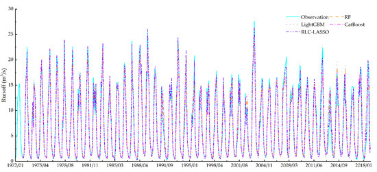 As can be seen from the evaluation metrics reported in Table 5 for Zamusi station, among the single models, the results were the same as for Jiutiaoling station, with the best performance from RF in the training period and the best performance from CatBoost in the validation period. Compared with the three single models and RLC-LASSO, the R of RLC-LASSO in the training period was 0.99, which was the same as that of the best-performing single model, RF. The NSE of RLC-LASSO was 0.02 higher than that of RF in the training period, and both the RMSE and MAE were lower than those of RF. The R of RLC-LASSO was greater than that of any of the three single models in the validation period, and the NSE was 0.035 higher than the highest value for a single model, CatBoost, while the RMSE and MAE values were lower than those of any of the three single models. The fits of the monthly runoff from Jiutiaoling and Zamusi stations during the training and validation periods are shown in Figure 8 and Figure 9.