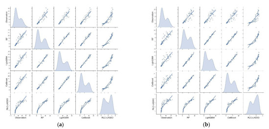 To further verify the effectiveness of the RLC-LASSO method, scatter plots of the results of each model validation period, showing comparisons between pairs of models and with the observed values, are given in Figure 10 for Jiutiaoling and Zamusi stations. From the results for Jiutiaoling station shown in Figure 10a, it can be seen that the R2 of RLC-LASSO was the highest among the fitted lines with the observed values, with a value of 0.9211. The R2 values of the fitted lines between the predicted values of the three models, RF, LightGBM, and CatBoost, were greater than 0.98, which indicates that the prediction effects of these three models were comparable, and that integration by LASSO combined the advantages of these three single models.