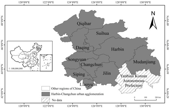 The original data of economic efficiency and economic resilience were obtained from the China City Statistical Yearbook, Jilin Statistical Yearbook, Heilongjiang Statistical Yearbook and the Statistical Bulletins on the national economic and social development of the cities of Harbin, Qiqihar, Daqing, Mudanjiang, Suihua, Changchun, Jilin, Siping, Liaoyuan, and Songyuan. In this paper, we selected the Harbin–Changchun urban agglomeration as the study area (Figure 2); the Yanbian Korean autonomous prefecture lacked sufficient data and was not included in the study. The rest of the missing data were added by the interpolation method.