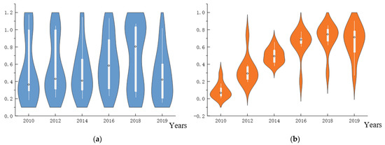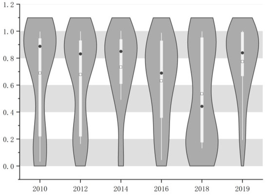 In terms of temporal trends (Figure 6), the synergistic evolution of economic efficiency and economic resilience in the Harbin–Changchun urban agglomeration generally fluctuated in the direction of advanced synergy. From 2010 to 2019, there was an obvious distinct phase pattern, and the synergistic effect showed a “down-up-down” change pattern. The synergistic value kernel density curve shows a “double peak-single peak-double peak” change trend, with significant differences between regions. From 2010 to 2014, the width of the peak gradually narrowed, the quartile range was significantly reduced, and the structure changed from “double peak” to “single peak”. These findings indicate that cities are clustering towards a high level of synergy, and the differences between regions have decreased. From 2014 to 2018, the kernel density curve shifted downwards, with a shift in structure from “single peak” to “double-peak”. The width of the low-value interval increased, the synergistic effect gradually decreased, and the differences between regions expanded. In 2019, the kernel density curve showed a single peak structure, the synergistic effect increased, and the differences between regions narrowed.