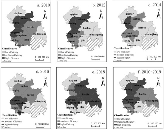 As shown in Figure 4, the low efficiency area includes the two cities of Qiqihar and Jilin. The low level of economic efficiency in Qiqihar was due to the fact that Qiqihar is an old industrial city, with high emissions caused by a high proportion of heavy chemical industries, as well as the influence of the planned economic system. This has resulted in an extensive management model and a lack of awareness of independent innovation among enterprises, making it difficult for those enterprises to improve their technology. The economic efficiency of Jilin City displayed a tendency of first rising and then falling. The city showed an upward trend from 0.29 (in 2010) to 0.35 (in 2013), and then a decline under the influence of the overall economy of Northeast China, from 0.21 (in 2014) to 0.16 (in 2019). The annual average decline was 5%, indicating an economic structure that is dominated by heavy industry and state-owned enterprises makes that local economy vulnerable to the overall economy of Northeast China, and also limits the renewal of enterprise management models.