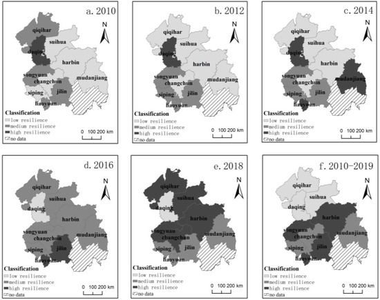 As shown in Figure 5, the low resilience area includes three cities: Daqing, Suihua, and Qiqihar. The main reason for Daqing having weak economic resilience is that the degree of industrialization of petroleum industries is high. There is a relatively single industrial structure and high dependence on foreign trade, which makes the city less resilient to recovery. Suihua is vulnerable to risks (such as an economic crisis) because of its weak economic foundation, insufficient accumulation of social capital, small scale of leading industries, and small proportion of secondary and tertiary industries. Qiqihar is dominated by heavy industry, and the city’s ability to innovate is inhibited by the slow development of its tertiary industries, the low degree of industrial upgrading, and the backward technology updating of traditional industries.