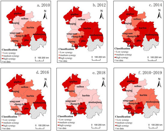 Based on the principles of the Haken model, the economic efficiency and economic resilience synergy scores of the cities in the Harbin–Changchun urban agglomeration from 2010 to 2019 can be obtained using Equation (11). However, the d-value (Equation (11)) represents the distance between the measured point and the stable point of the system, and the distance is inversely proportional to the synergy. Therefore, the d-value needs to be normalized and the resulting synergy value divided by Jenks natural breaks optimization method of ArcGIS 10.6.