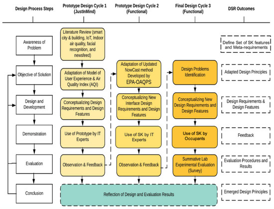 The research design comprised multiple design cycles conducted to test application functionality, improve the design, and achieve the requirements from the knowledge base and the environment. The design cycles are grouped into three cycles (Figure 1). In the first design cycle, we presented a prototype of the SK interface using the JustInMind simulator tool. We conducted a focus-group interview with four occupants to demonstrate the simulation and obtain feedback. The feedback was applied to the design of a functional prototype. We presented the functional prototype to our lab members after improvement from the previous round of feedback. Feedback from the demonstration sessions yielded further interface improvements for the final version of the prototype.