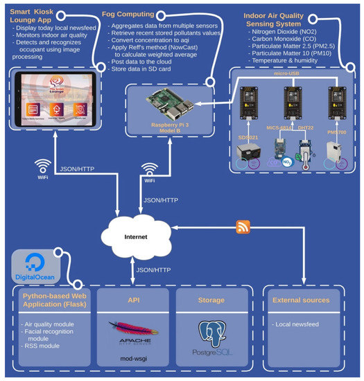 Users interact with the Android tablet interface, which runs the three separate applications. We wrote the web application and fog computing code in the Python programming language. The tablet application communicates with Digital Ocean using JavaScript Object Notion (JSON) messages over a representational state transfer (RESTful) API. In addition, a Raspberry Pi (Rpi3) is used as the fog computing platform to which air quality sensor microcontrollers communicate. The microcontrollers connect to the Rpi3 through Micro USP. The Rpi3 also communicates with Digital Ocean over RESTful API. PostgreSQL is a database used for SK data storage. PostgreSQL is an open-source object-relational database-management system.