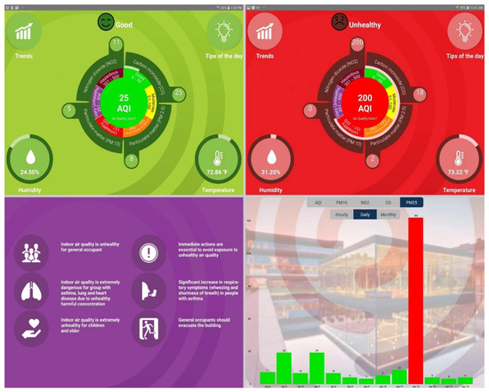 The tablet-based SK application presents the current indoor air quality collected from sensing and fog computing data that is received from the cloud. The design of the interface background used the idea of AQI color-code categories as representations of the air-quality level. AQI color-code categories provide an easy, simple, and quick interpretation of the air-quality level. As shown in Figure 5, a green-interface background is displayed to represent good air quality. The background color changes to red and purple to represent unhealthy and very unhealthy air-quality levels, respectively (see Figure 5, top right and left). In addition to displaying the current air quality, humidity, and temperature data, the service provides two related features. First, the service demonstrates the risks associated with current air-quality level, if any and gives recommendations to either minimize occupants’ exposure to such risks or maintain the good air quality.