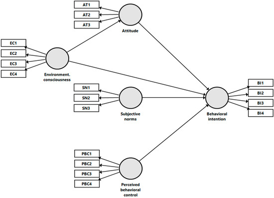 As for the relationship between environmental consciousness and behavioral intention, starting from previous research [63,64], the following hypothesis was formulated: