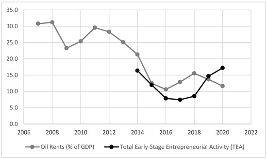 These weaknesses in business sophistication and knowledge and technology outputs must be addressed to increase the levels of innovation and, consequently, attain higher economic diversification and sustainable development. The assumption is that entrepreneurial leaders must overcome these challenges and bring innovations to the market. In the case of Qatar, the QNV 2030 was established in 2008 following the 2007 global economic crisis, when oil revenues as a percentage of the GDP were at their peak. Revenues have been following a downward trend, going from 31.2% to one of the lowest levels, with 11.7% in 2020 (see Figure 1). The GEM’s TEA indicator started reporting in 2014 with a high rate of entrepreneurial activity that later decreased. The loss of oil revenues suggests an inverse relationship between the two, with an increasing TEA rate in recent years. Hence, to address the status of innovation dynamics in depth, this research explored secondary data available in Qatar’s strategic technology sectors and crossed it with primary data collected through in-depth interviews with start-up founders. This data triangulation approach also provides a deeper understanding of the drivers of entrepreneurship, innovation, and sustainability in the entrepreneurial ecosystem where they operate their businesses.