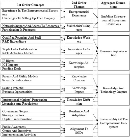 The interviews were transcribed and coded into nodes and themes using Nvivo 10 software. As argued before, based on the GII, the business sophistication and knowledge and technology outputs are the weakest performing in Qatar, so these were incorporated into the research design. In addition, participants were asked to elaborate on their perceptions of the extent of the entrepreneurial ecosystem’s enabling conditions, familiarity, and integration of sustainability efforts. It was essential to begin with first-order concepts to introduce the interview’s inductive approach. The challenge was to make judgment calls and choose the theme that most closely corresponded with the node. Figure 2 illustrates the progression of the interviews from the first-order questions to second-order themes to aggregate dimensions. The methodology has been used in qualitative studies to understand key entrepreneurial ecosystem players [44,47].