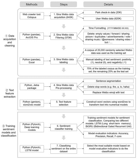 In recent years, social media platforms have garnered interest in obtaining geospatially explicit and socially relevant data sets [,,,]. Platforms such as Twitter and Weibo have become ubiquitous and important for social networking and content sharing [,]. The widespread use of these platforms has enabled researchers to obtain large-scale and long-term databases on socially subjective information quickly and inexpensively []. Advanced artificial intelligence and deep learning techniques have helped magnify and improve on these advantages improved by advancing an ability to analyze social media text and conduct socially relevant sentiment analysis.