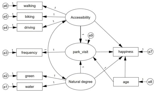 Taking Shanghai as a case study area, the structural equation model was elaborated and consists of a measurement model and a structural model (Figure 3). In which, the average sentiment score and frequency of park visiting were selected as endogenous variables, while the accessibility and natural degree of the parks were extracted according to the former studies as exogenous variables. In addition, the age of the study objects was used as a control variable. IBM SPSS Amos 28 Graphics was used to analyze the association between expressed happiness and various factors. ArcGIS Pro and Python (an interpreted, high-level programming language) were used for mapping the results. The following five hypotheses were proposed to verify the relationship between expressed happiness and urban park characteristics:
