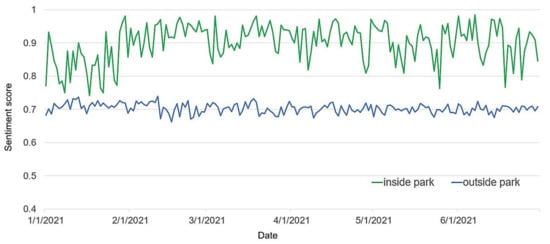 Figure 4 showed significant differences in reported happiness inside and outside urban parks. Generally, the results showed that people who have access to urban park services express more feelings of happiness. The sentiment score inside parks starts to rise in February when the Spring festival starts. Based on text contents, the potential reason for the relatively low sentiment score in January may be the low temperature. Similarly, the fluctuation during May and June may also be caused by the high temperature.