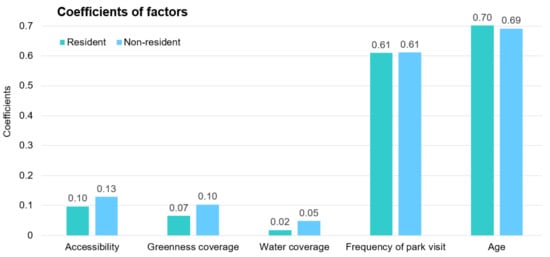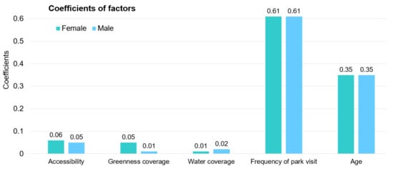 When comparing the results between residents and non-residents (Figure 6), there existed both commonalities and disparities. The residents and non-residents are distinguished by their location from their personal information. For both groups, the factors ‘age’ and ‘frequency of park visit’ had the highest values of coefficient. This result might indicate that people who are older and have a relatively high frequency of park visits tend to have a higher level of happiness. As for differences, ‘naturalness’ and ‘accessibility’ had a greater impact on the happiness of non-residents than residents. In addition, for residents, accessibility was more important than naturalness, while for non-residents, these two factors had the same relationship, the degree of difference between the two was smaller (resident: 0.097 − 0.065 = 0.032; non-resident: 0.129 − 0.103 = 0.026). The differences in results between genders were relatively small (Figure 7). For females, the greenness coverage was more important than for males while the water coverage was the opposite.