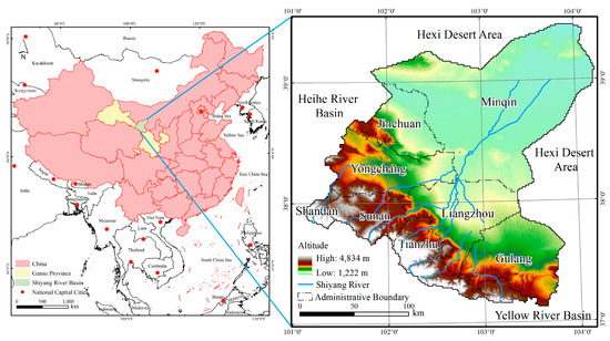 The Shiyang River originates in the southeastern part of the Qilian Mountains in Northwest China, flows through the cities of Wuwei and Jinchang, and finally disappears into the Minqin Oasis between the Tengger Desert and the Badain Jaran Desert (Figure 1). The entire basin is located in the central part of Gansu Province, which lies in the easternmost part of the Hexi Corridor (101°41′–104°16′ E, 36°29′–39°27′ N) [34]. The study area covers 39,492 km2, and the elevation ranges from 1222 to 4834 m. It is generally characterized by a continental temperate arid and semiarid climate, with intense solar radiation, sufficient sunshine, significant temperature difference, little precipitation, and intense evaporation [35].