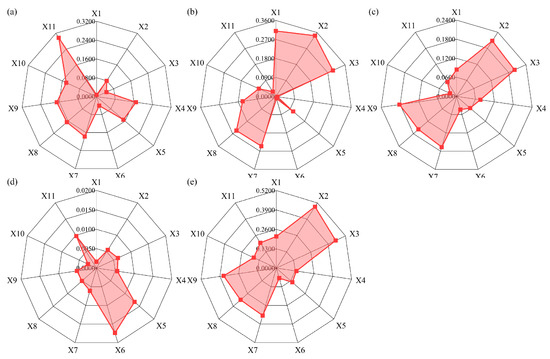 Driving forces behind the spatial distribution patterns of five primary LULC categories in the SRB during 2000–2018: (a) cropland, (b) forest, (c) grassland, (d) settlement, and (e) bare land. Notes: The explanatory power of each factor in this figure was the multiyear mean value of the q statistics from 2000 to 2018. The q statistic of each factor in each year passed the significance test. The factor codes are as follows: X1, temperature; X2, precipitation; X3, altitude; X4, population density; X5, GDP; X6, GDP per capita; X7, total water consumption; X8, surface water supply; X9, groundwater supply; X10, distance to the rivers; and X11, distance to urban and township centers. The definitions of each factor are detailed in Table 1.
